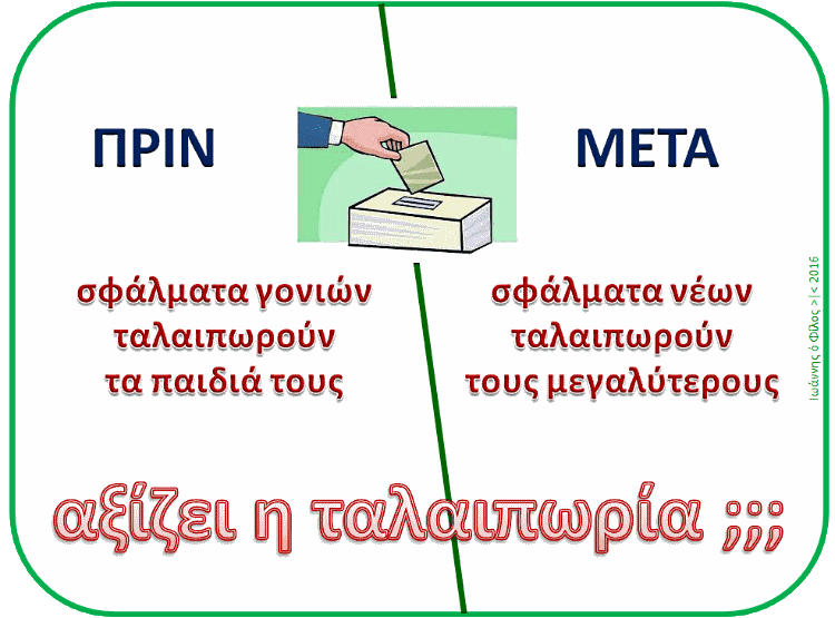 Ρωτώ τον διπλανό μου, τον γείτονα μου, τον φίλο μου, τον συγγενή, ποιον θα ψηφίσει και γιατί; Θέλω να μάθω τι θα γίνει αύριο και μεθαύριο, το χθες δεν διορθώνεται πλέον. Δυστυχώς η απάντηση που παίρνω είναι, δεν θα πάω να ψηφίσω. Δηλαδή δράμα. Σκόρπιες ψήφοι, ίσον, δοκιμασία της αντοχής του Ελληνικού Λαού και πάλι…… δεν θα μας αξίζει η Ελευθερία, Δυστυχώς. Δεν μπορούμε να συνεργαστούμε, δεν κυβερνούμε. Μας εξουσιάζουν και είναι κρίμα.